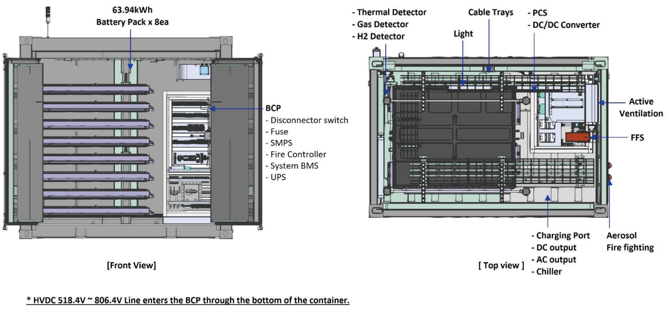 | Bank Container specification | Capacity | 511.49kWh(63.96kWh x 8ea Battery pack(2Series, 4Parallel)) |